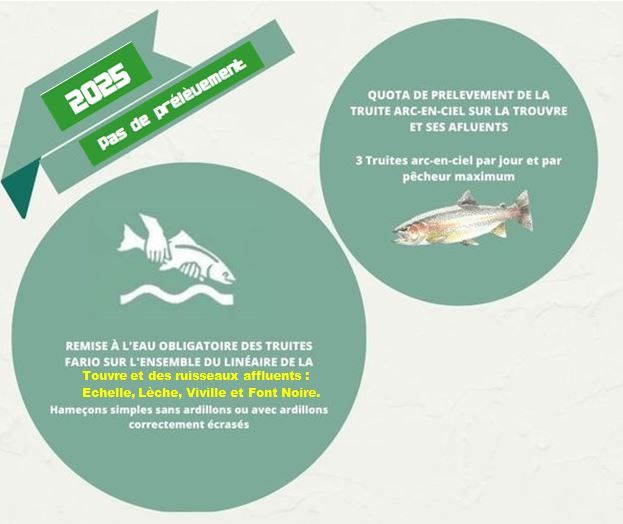 Le quota de prélèvement de truite arc-en-ciel est réduit à 3 par jour et par pêcheur, sur l'ensemble de la Touvre et les ruisseaux affluents: Viville, Echelle, Lèche et Font Noire.